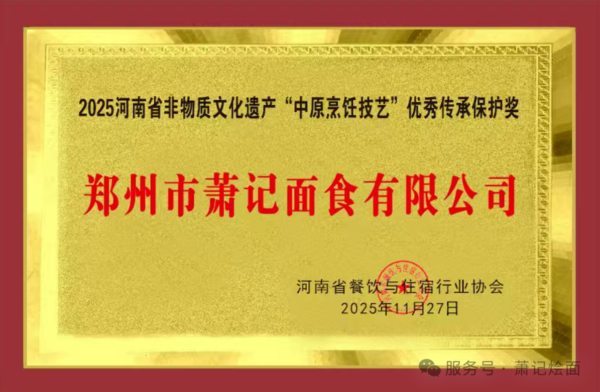 萧记烩面荣获“2025河南省非物质文化遗产“中原烹饪技艺”优秀传承保护奖”
