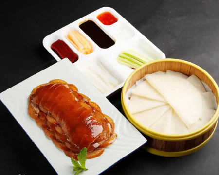 北京烤鸭是具有世界声誉的北京著名菜,起源于中国南北朝时期,《食珍录》中已记有炙鸭,在当时是宫廷名菜。用料为优质肉食鸭,果木炭火烤制,色泽红润,肉质肥而不腻,外脆里嫩。北京烤鸭分为两大流派,而北京最著名的烤鸭店也即是两派的代表。它以色泽红艳,肉质细嫩,味道醇厚,肥而不腻的特色,被誉为“天下美味”。