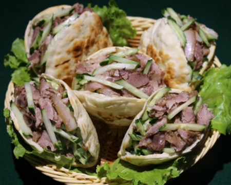 回郭镇肉合制作技艺是将新鲜的猪肉下水经过几道工序清洗干净,放入百年老汤中煮熟,再用独家秘制的蒜汁慢慢搅拌,让汁液充分溶入肉中,最后加入刚出炉的烧饼中。烧饼由硬面制作,焦而不干,脆酥可口,肉瘦中有肥,肥而不腻,还可根据个人口味相互掺和。回郭镇肉合的制作不但对原材料的选用有严格的要求,既要求制作者调和五味,还要求馍与肉的制作者对火候的适时掌控能力。因此回郭镇肉合具有饼酥脆、肉软香、菜爽口的特征。
