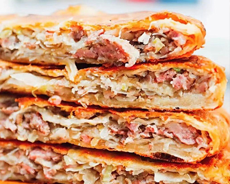 濮阳壮馍是河南濮阳传统面食,别称状元馍,呈圆形,直径约30厘米,面皮分四层,以小麦粉、鲜羊肉、大葱、粉皮等为主要原料,配以葱、姜、菜蔬、香油等多种祖传佐料,经半发酵面包裹肉馅后平底煎盘煎炸制成,成品外焦里嫩、鲜而不膻。