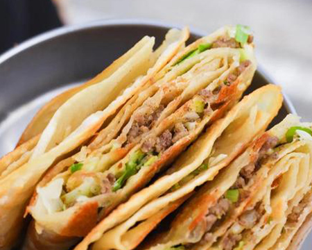 羊肉炕馍是河南省开封市传统夜市小吃,起源于街头烙馍制作技艺。该小吃以双层薄面饼夹羊肉末为主要特征,配以葱花、盐、孜然等调料,经铁鏊煎烙至外皮焦黄酥脆,具有"焦香肉末味足"的独特风味。据2018年央视财经频道报道,西司夜市摊主二嫂夫妇坚持传统手工制作30年,日均制作量超200份,定价20元仍供不应求,成为开封夜市最具代表性的游客美食。