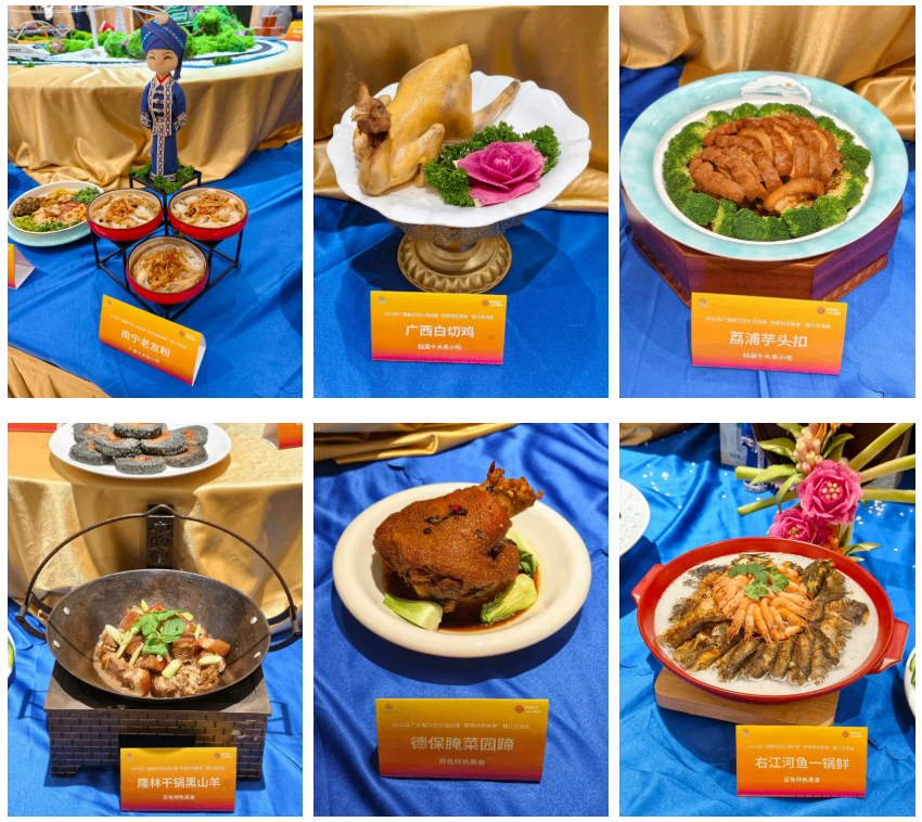 本次推介会创新采用“实地品鉴 + 云上直播”的形式,打破空间限制,让线上观众也能共享美食盛宴。大厨们现场秀出精湛厨艺,南宁老友鱼酸辣鲜香、北海酥炸沙虫外酥里嫩、梧州纸包鸡鲜嫩甘滑,还有凌云马恩艮等广西特色美食轮番登场,每一道菜品都堪称味觉与视觉的完美结合。在品鉴环节,嘉宾们手持餐盘,穿梭于各式美食之间,或细品慢尝,或交流分享,在传统与创新交融的 “广西味道” 中沉浸式体验广西各地美食的独特风味。