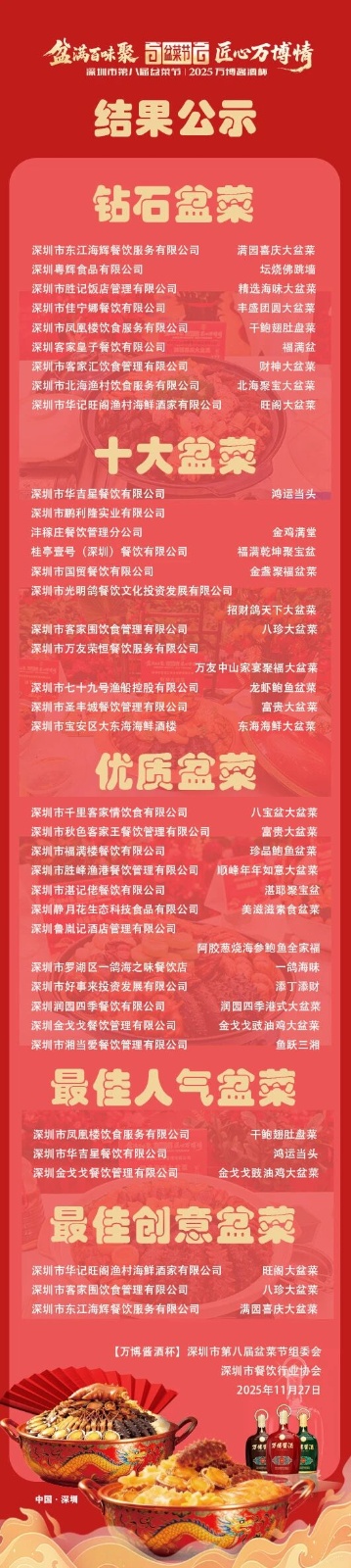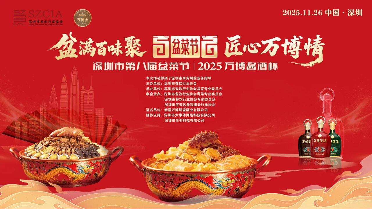 第八届盆菜节由深圳市商务局业务指导、深圳市餐饮行业协会主办、由深圳市餐饮行业协会盆菜专业委员会、粤菜专业委员会、专家委员会及宝安区餐饮服务行业协会联合承办,于2025年11月26日,在福田区凤凰楼酒家-锦绣厅隆重举办。这项深圳餐饮文化的重要品牌活动,已成为展示地方特色与创新烹饪技艺的重要平台。